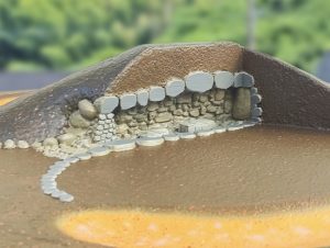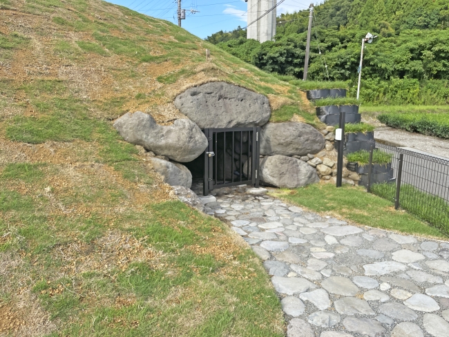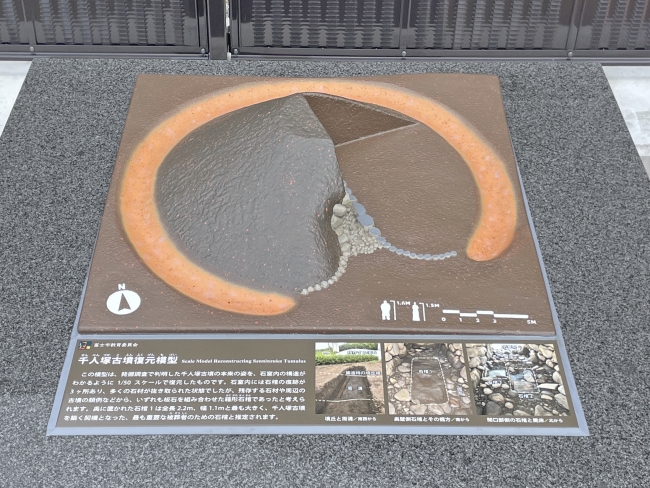 古墳を模型で表現したジオラマサインはFRP製で出来ており、古墳の内部までイメージ出来るサインになっています。横穴式石室をリアルに表現してあり、地形や施設配置を立体的に把握でき、文字が苦手な子どもや外国人にもわかりやすくなっています。ジオラマサインがあることでワクワク感を演出し、学習の体験価値を高めることができます。