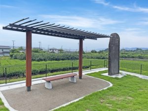 大きな石碑の隣には休憩施設としてパーゴラを設置しています。茶畑とその先には駿河湾が広がり、景色を楽しみながら休憩できます。